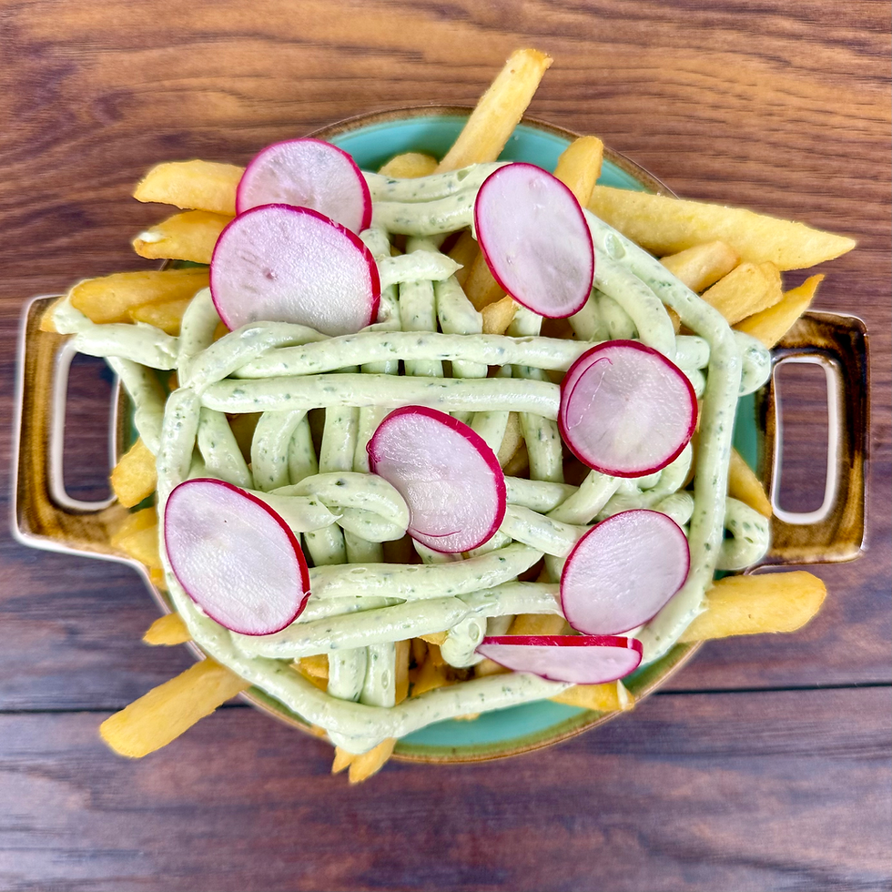 EN: golden fries topped with our homemade wild garlic cream and crunchy radisches
